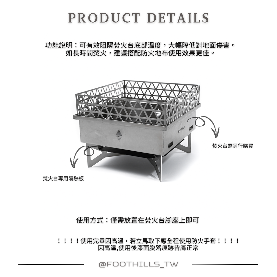 !!可單買!!此款隔熱板專為焚火台設計,大幅度隔絕高溫,防止熱度傳導至草地或地面,避免燒焦痕跡或損害環境 👌🏼輕便好攜帶,無論是在露營地或戶外活動皆適用,讓您享受戶外篝火的溫馨,同時安心保護自然環境,必備的露營好夥伴!(若長時間燃燒或火勢過大,還是建議可搭配防火地墊使用喔~)![]()